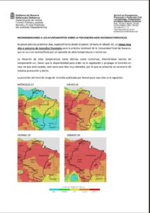 El Gobierno de Navarra, a través del Servicio de Emergencias, Prevención y Protección Civil, ha emitido un aviso en el que se informa de un riesgo muy alto a extremo de incendios forestales previsto desde el jueves 18 hasta el sábado 20 de septiembre, debido a las altas temperaturas y la presencia de vientos del sur.