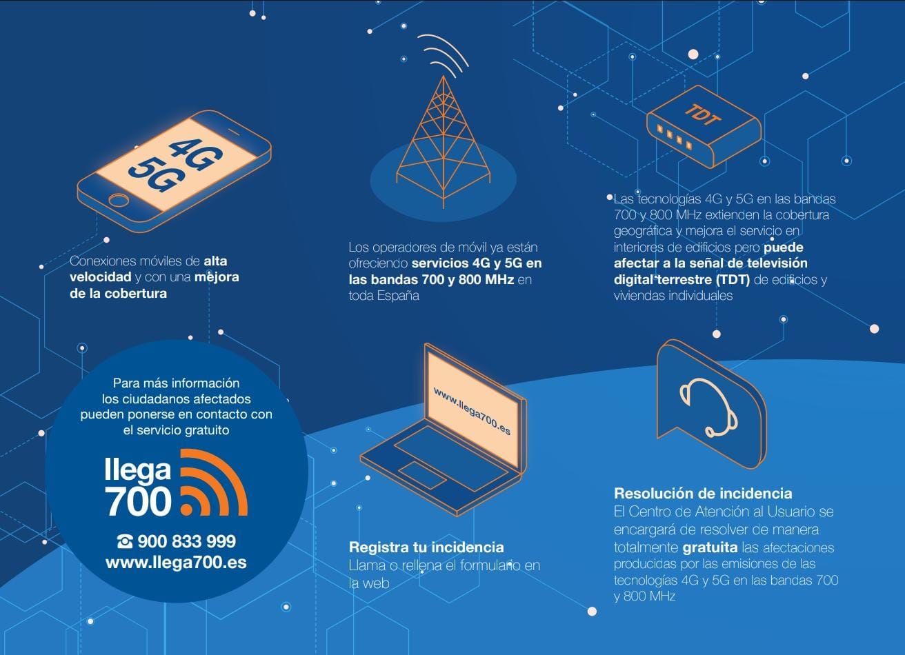 El procedimiento es sencillo: si notas problemas en tu señal de televisión tras el despliegue del 4G o 5G, puedes registrar tu incidencia llamando al teléfono gratuito 900 833 999 o a través de la web www.llega700.es. Un técnico especializado valorará la situación y se encargará de la resolución sin coste alguno para el usuario.